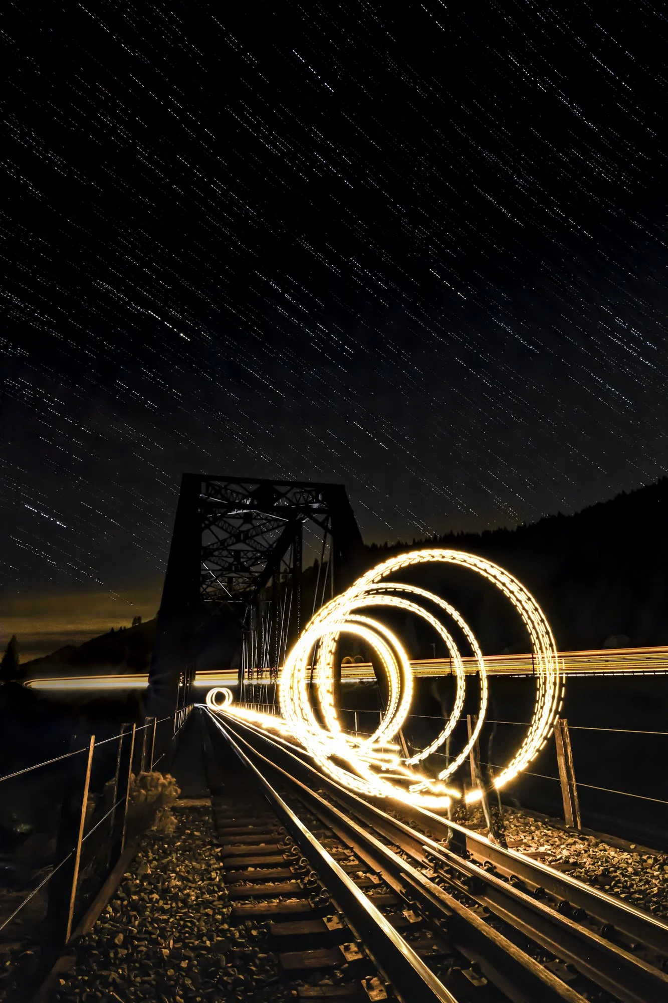 In Search of Light was my final project in art school—born from long nights in the desert, river canyons, rail yards, and forgotten corridors where humanity and wilderness meet the edge of the unknown. These images are experiments in time and perception, using long exposure and light painting to reveal a world that exists just outside ordinary sight. Circles, portals, and burning forms ask a simple question: what lives in the space between who we were and who we’re becoming? The desert taught me patience. The night sky taught me scale. Fire and movement taught me that transformation is rarely gentle. This series explores transition—between darkness and dawn, chaos and clarity, earth and cosmos. It is a study of hope through motion and stillness, of persistence in lonely places, and of light as both guide and witness.